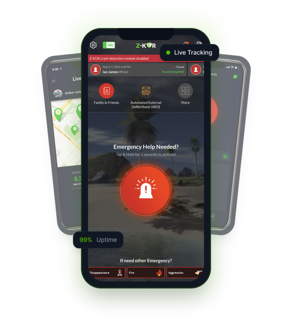 Our solution is consisting of a Mobile App & a WebApp providing your situation to our Z-Kur Call Centre who will relay all useful information to the Emergency services in order to optimise your chances of being secured.